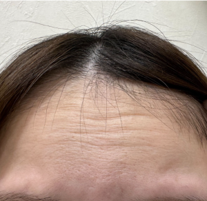 マニアックな話になりますが、上記の瞼が重くなる副作用を懸念され、額の上の方に注入をご希望される方がしばしばいらっしゃいます。前頭筋は縦方向に筋肉が走行しており、下の方は目を見開く動き、上の方は髪の生え際を下げる逆の動きをします。上の方に注入することにより、髪の生え際を下げる筋肉の動き止まるかもしれませんが、眉間の上など額の下の方が代償的により動き始める(下の方のお皺がかえって目立つ)可能性がありますので、投与量や注入部位などしっかり擦り合わせる必要があります。